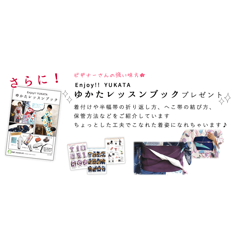浴衣の柄 No.1 水色地桜づくし No.2 濃紫地桜づくし No.3 濃紺地雪輪に桔梗 No.4 生成り地雪輪に桔梗 No.5 黒地ストライプ桜 No.6 紺地ストライプ桜 No.7 クリーム地大輪牡丹 No.8 白地ピンクぼかしブルー桜 No.9 白地ブルーストライプ椿 No.10 白地赤ストライプ椿 No.11 紫地矢絣 No.12 白地朝顔 No.13 オフホワイト地麻の葉に紫牡丹 No.14 白地麻の葉に赤牡丹 No.15 黒地くす玉 サイズ・素材 【浴衣】 フリーサイズ/綿100% no1・2・9〜11の柄 身丈:163cm・袖丈:49cm・裄丈:67cm no3〜8・12〜15の柄 身丈:163cm 袖丈:49cm 裄丈:68cm 適応身長 155cm〜165cm 【浴衣帯(リバーシブル半幅帯)】 ポリエステル100% 【下駄】 桐 フリーサイズ 適応サイズ22.5cm〜24.5cm ※Lサイズもご用意しています! プラス500円(税別)にてご用意致します。